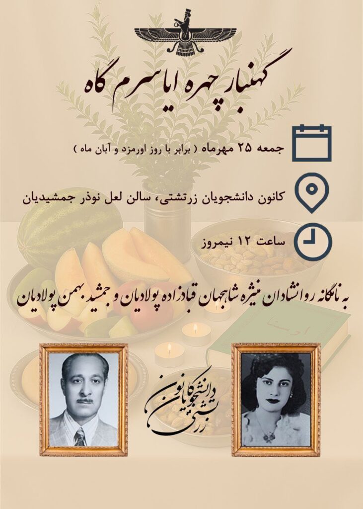 کانون دانشجویان زرتشتی در نظر دارد در روز اورمزد و آبان ماه برابر با آدینه ۲۵ مهرماه، ساعت۱۲:۰۰ نیمروز، در تالار کانون دانشجویان زرتشتی (لعل