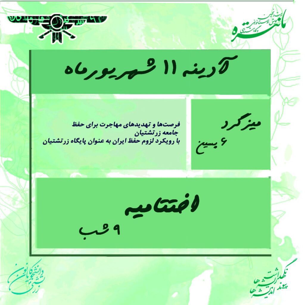 برنامه جمعه، ۱۱ شهریورماه به شرح زیر میباشد: میز گرد؛ ساعت ۶ پسین اختتامیه؛ ساعت ۹ شب همکیشان گرامی برای حضور در میز گرد میتوانند