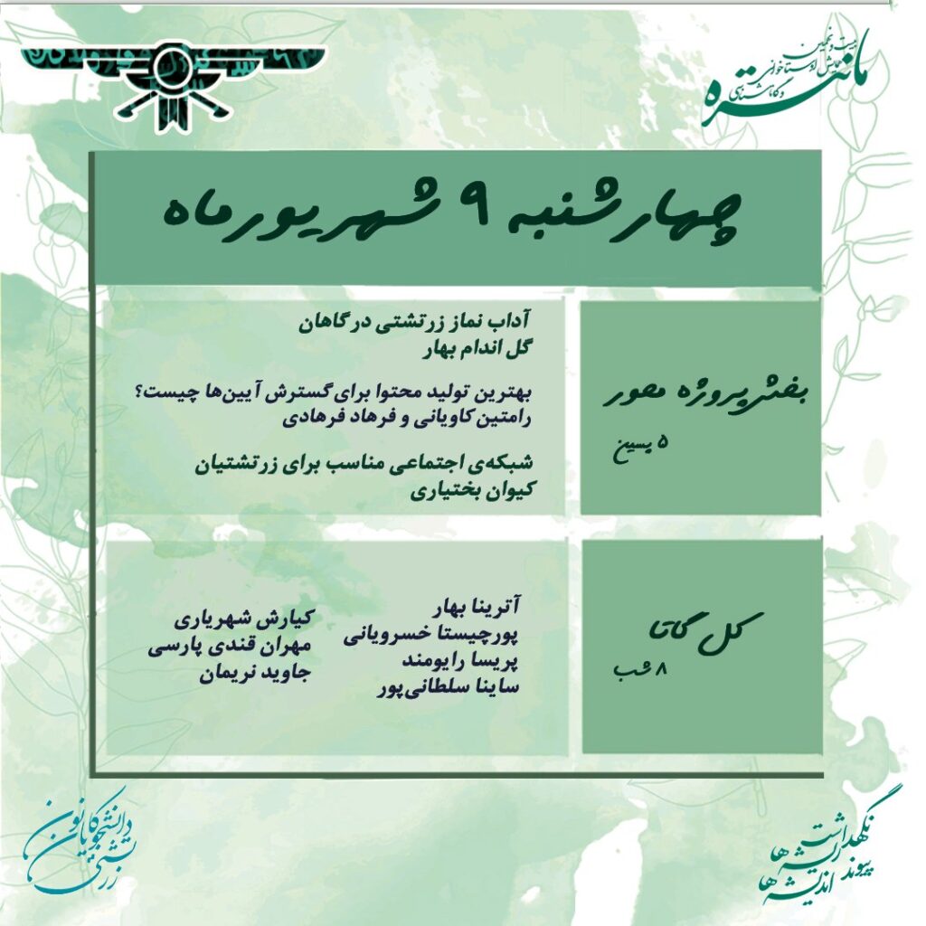 برنامه چهارشنبه، ۹ شهریورماه به شرح زیر میباشد:زیربخش پروژهمحور؛ ساعت ۵ پسینرده کل گاتا؛ ساعت ۸ شب همکیشان گرامی میتوانند از طریق لینک زیر و