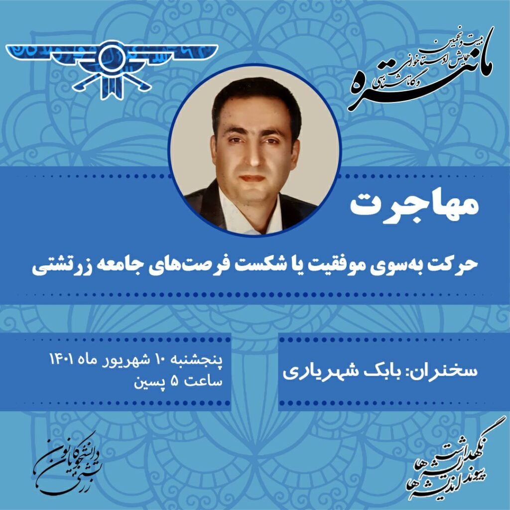 مهاجرت، حرکت به سوی موفقیت یا شکست فرصتهای جامعه زرتشتی ? در راستای برگزاری بیست و نهمین همایش اوستاخوانی و گاتاشناسی مانتره، در خدمت سخنران
